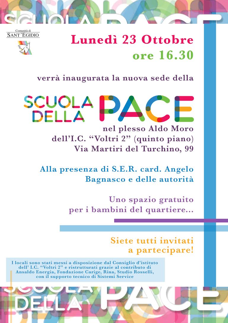Lunedì 23 ottobre alle h.16,30 verrà inaugurata la nuova sede della Scuola della Pace della Comunità di Sant’Egidio, al quinto piano del plesso Aldo Moro dell’Istituto Comprensivo “Voltri 2”, alla presenza dell’arcivescovo di Genova, cardinale Angelo Bagnasco, dell’assessore alle politiche educative del Comune di Genova Francesca Fassio, del presidente del municipio Ponente Claudio Chiarotti e di numerose autorità.