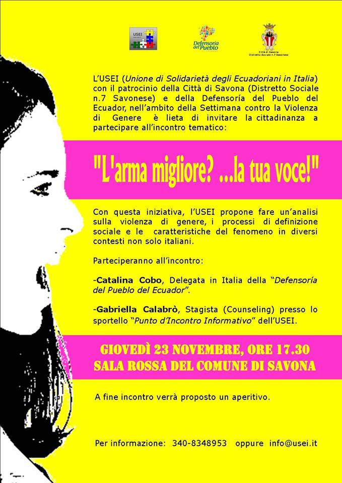 Savona.- Giovedì 23 Novembre 2017 a Savona, ore 17.30, presso la Sala Rossa del Palazzo del Comune, l’Associazione USEI (Unione di Solidarietà degli Ecuadoriani in Italia), con il patrocinio della Città di Savona (Distretto Sociale n.7 Savonese) e della Defensoría del Pueblo del Ecuador, organizza l’incontro tematico “L’arma migliore? ….la tua voce”.