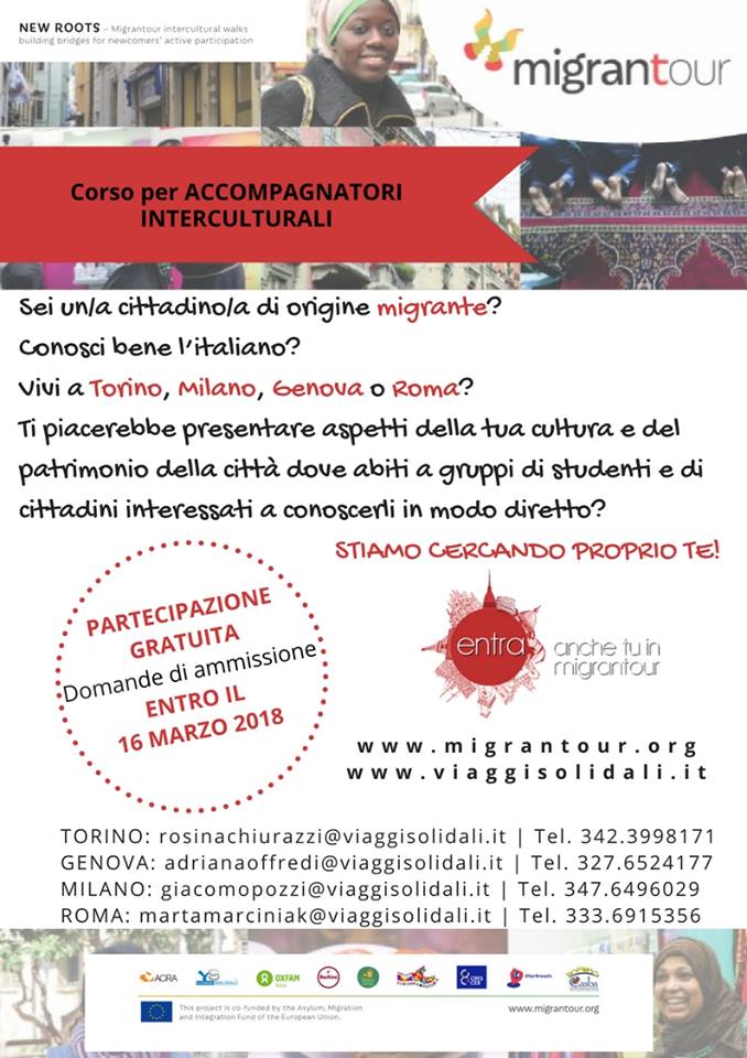 Parte a Torino, Genova, Milano e Roma (e prossimamente nelle altre città coinvolte) il nuovo corso per accompagnatori interculturali nell’ambito di “NEW ROOTS – Migrantour intercultural walks building bridges for newcomers active participation” progetto europeo promosso da ACRA, Viaggi Solidali, Oxfam Italia, Baština, Terra Vera, Renovar A Mouraria, CRESCER, Alter Brussels e Casba Società Cooperativa Sociale.
