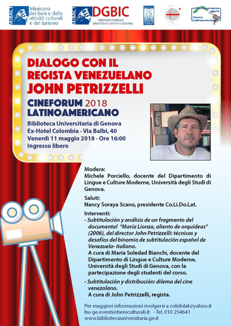 In occasione del ultima data del Cineforum latinoamerciano conterà con la presenza del regista del Film-documentario “Maria Lionza: Aliento de Orquideas” il Sig. John Petrizzelli.