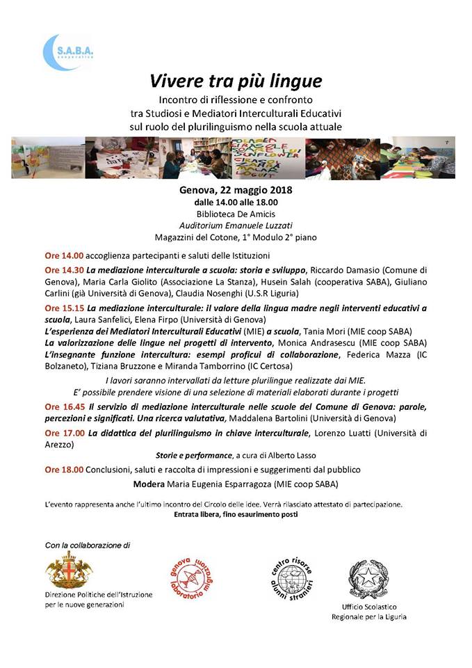 Genova.- Martedí 22 Maggio. Vivere tra più lingue. Incontro di riflessione e confronto tra Studiosi e Mediatori Interculturali Educativi sul ruolo del plurinlinguismo nella scuola attuale.
