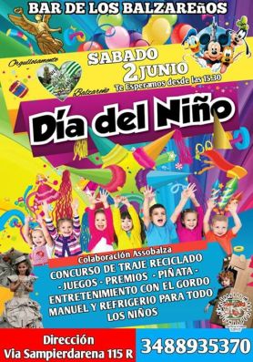 Como cada año el Bar de los Balzareños y la Asociación unen sus fuerzas para festejar el “Día Universal del Niño” al interno del festejo abra concurso del traje reciclado, juegos, piñatas, entreteniemiento, refrigerio.