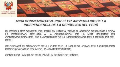 6 luglio 201814 febbraio 2019 Ivonnetorrestacle Génova.- El Consulado General del Perú en Génova conmemora los 197años de Independencia del Perú Génova.- Sábado 28 Julio. El Consulado General del Perú Conmemora los 197 años de Independencia de la República del Perú con una Misa. Lugar: Iglesia Don Bosco Vía Carlo Rolando 15 Sampierdarena Horas: 19:30 Condividi: Fai clic per condividere su X (Si apre in una nuova finestra) X Fai clic per condividere su Facebook (Si apre in una nuova finestra) Facebook Fai clic per condividere su WhatsApp (Si apre in una nuova finestra) WhatsApp Altro Fai clic qui per condividere su LinkedIn (Si apre in una nuova finestra) LinkedIn Fai clic per condividere su Telegram (Si apre in una nuova finestra) Telegram Mi piace Caricamento... Correlati