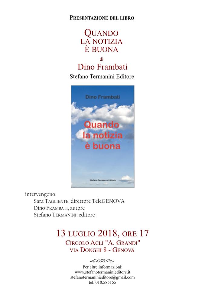 Genova.- Venerdí 12 Luglio, Presentazioni del libro “Quando la Notizia è buona” di Dino Frambati, presso il Circolo Acli “A Grandi” Via Donghi 8 Genova, alle 17. Modera la giornalista Sara Tagliente, Direttore Responsabile di Telegenova.