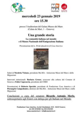 Fondazione Casa America Invita: Mercoledì 23 gennaio alle ore 15.30, presso l’auditorium del Galata Museo del Mare, si terrà l’incontro pubblico “Una grande storia“, presentazione dell’ultimo numero della rivista Quaderni di Casa America, dedicata all’emigrazione italiana in America latina e alla futura creazione a Genova del Museo dell’Emigrazione italiana.