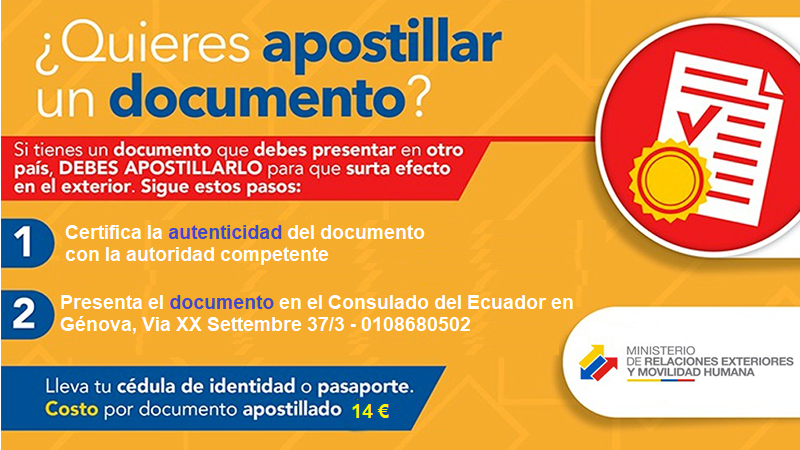 Desde hoy primero marzo, se podrá solicitar el trámite de apostilla en la Embajada y Consulados del Ecuador en Italia, estos podrán receptar y posteriormente emitir los documentos apostillados, anteriormente la única entidad autorizada a emitir documentos apostillados, era el Ministerio de Relaciones Exteriores y Movilidad Humana mediante sus oficinas en Ecuador. La implementación de la apostilla en el exterior por parte de la Cancillería ecuatoriana, es una forma de ampliar los servicios a los miles de compatriotas que residen en el mundo.