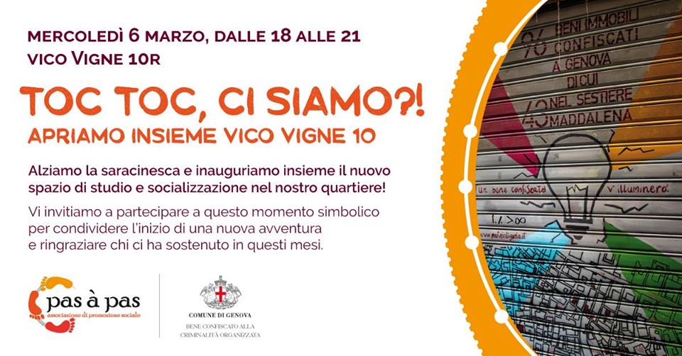 “TOC TOC, CI SIAMO?!” Apriamo insieme Vico Vigne! Mercoledì 6 marzo, h 18-21, Vico Vigne 10r Inaugurazione dello spazio di Vico Vigne 10 r, bene confiscato alla mafia e concesso dal Comune all’Associazione Pas à Pas per la creazione di un’aula-studio e un luogo aperto alla cittadinanza. Finalmente il momento è arrivato.