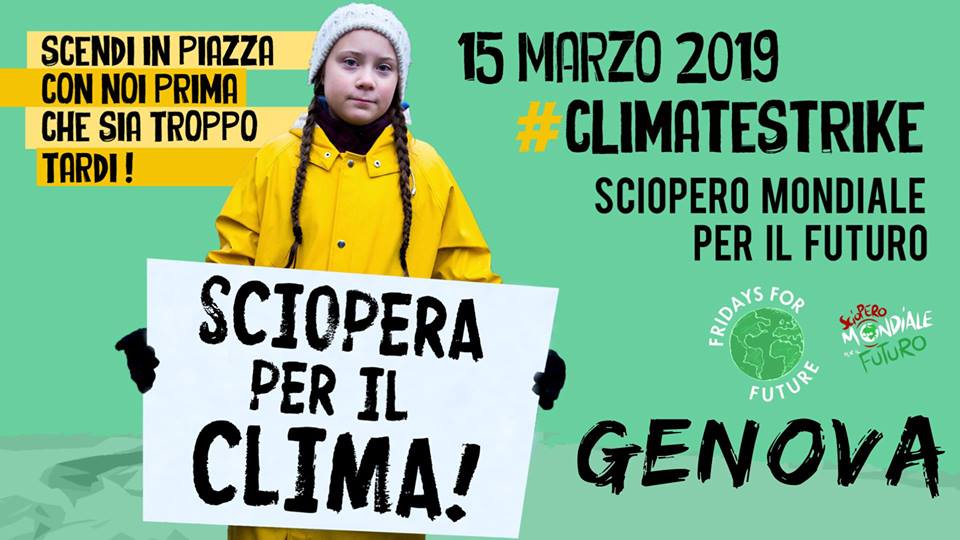 La mattina di venerdì 15 marzo 2019, contemporaneamente in tutto il mondo, si terrà una manifestazione per la mobilitazione internazionale. A Genova sarà alle 9.30 in Piazza De Ferrari.