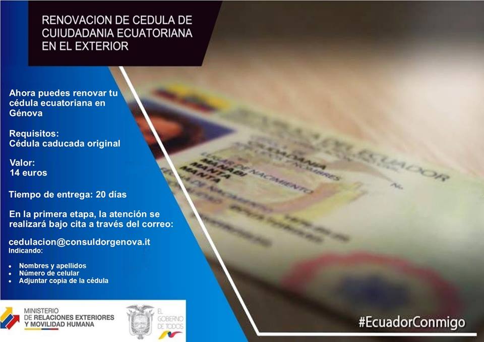 Génova.- Desde el próximo lunes1 de abril, los ciudadanos ecuatorianos podrán renovar la cédula de identidad, en el Consulado del Ecuador en Génova, ubicado en Vía XX Settembre 37/3. Esto gracias a un convenio de cooperación interinstitucional suscrito el 25 de noviembre de 2016, entre el Registro Civil (RC) y el Ministerio de Relaciones Exteriores y Movilidad Humana. Este servicio de renovación es disponible en otros consulados.