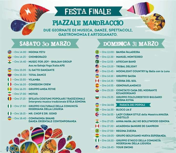 Popolazioni provenienti da tutti i continenti, che vivono a Genova ormai da molti anni e condividono con i genovesi la loro quotidianità, si raccontano sul palco della Festa Finale. C’è la Spagna, molti Paesi del Sudamerica, l’Africa, ma anche la Romania, la Bulgaria, Capo Verde, l’Irlanda, l’Iran e… non vi toglieremo l’effetto sorpresa, vi aspettiamo sotto al palco per goderci lo spettacolo insieme a voi!E non dimenticate che domenica 31 marzo alle ore 16:00 potrete essere spettatori della colorata Parata dei Mondi. Preparate la macchina fotografica, settatela sulla saturazione massima, immortalate i variopinti costumi tradizionali e quando condividete le vostre foto sui social non dimenticate di usare l’hashtag #FestaDeiMondi19