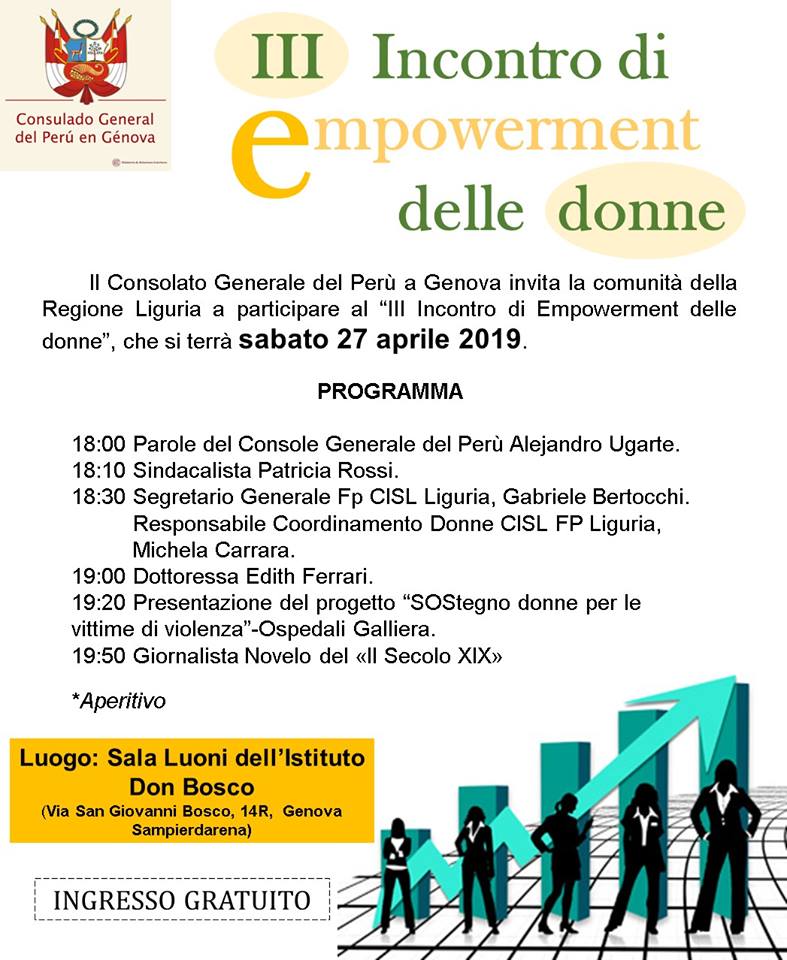 El Consulado General del Perú en Génova invita a la comunidad de la Región de la Liguria al “III Encuentro de empoderamiento de la mujer”.