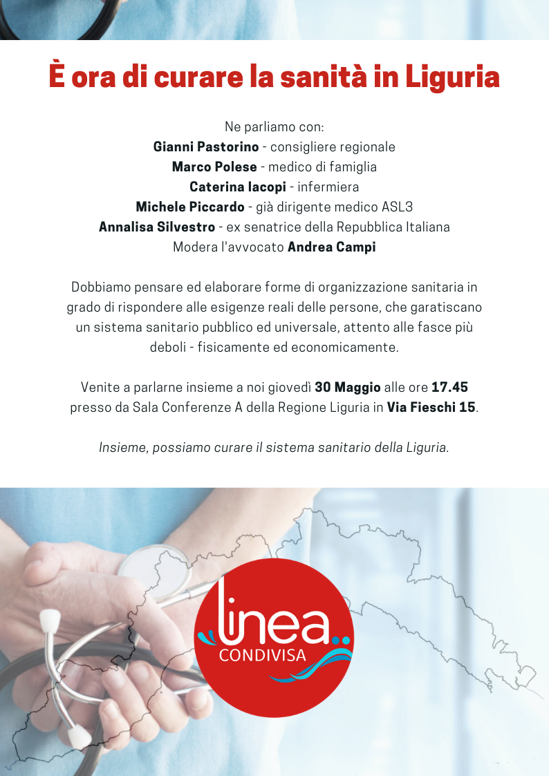 Tavola rotonda “È ora di curare la sanità in Liguria” – giovedì 30 maggio, ore 17.45, Sala A di Regione Liguria (via Fieschi 15). “Sanità pubblica, attenzione alle fasce deboli, accessibilità alle cure, malattie croniche: una riflessione a tutto campo”.
