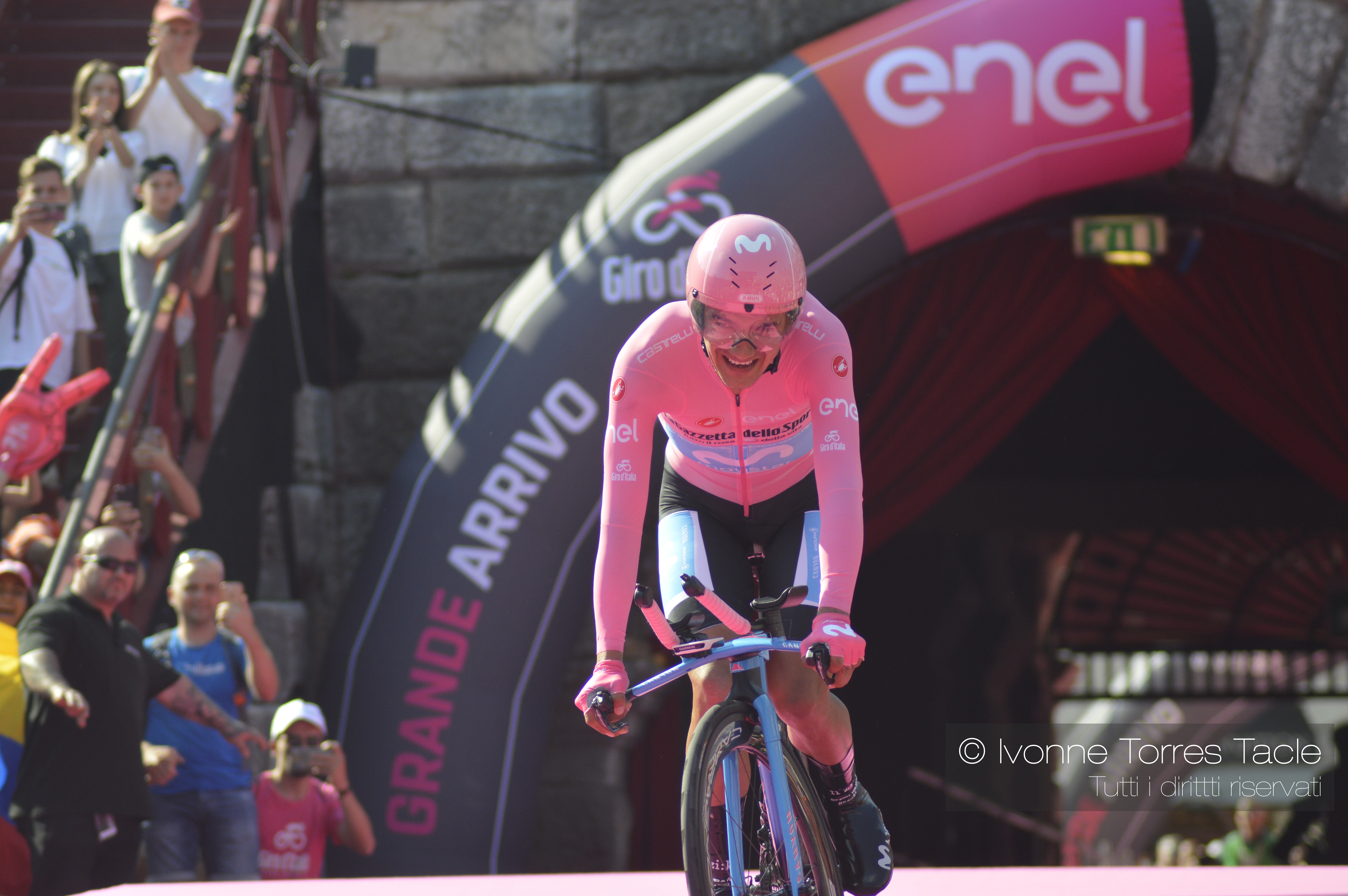 Carapaz, ingresa a la Arena de Verona, no lo podría creer de haber realizado tan importante hazaña, llora, minutos interminales donde en la arena de Verona, se escucha a coro “Carapaz, Carapaz” de los ecuatorianos presentes se inundan de emoción acompañando a su héroe, apenas llega atrás del palco su primer abrazo es para su amada madre, padre, y su esposa e hijos.