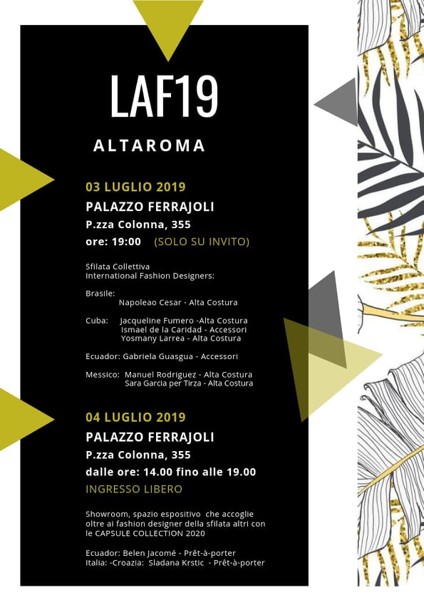 - 3 luglio 2019 ore 19.00 – Sfilata Collettiva Stilisti Latino Americani e Cocktail – Solo su invito