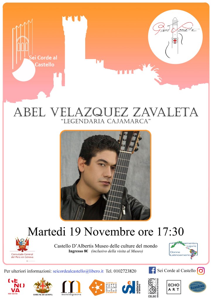 Genova.- Martedí 19 ore 17.30 al Castello d’Albertisci sará il noto chitarrista peruviano, Abel Velásquez Zabaleta lui, é tra i più importanti concertisti di chitarra peruviani. Fa parte dell’ensemble di strumenti tradizionali del Perù e svolge attività concertistica in Spagna,Germania, Francia, Italia, Argentina, Cile. Ha terminato gli studi presso il IV Master di chitarra classica organizzato dall’Università di Alicante – Spagna, guidato da concertisti e doventi di fama internazionale come David Russell, Manuel Barrueco, Pepe Romero, Sergio e Odair Assad, Fabio Zanon, Ignacio Rodes, Stefano Grondona e Paul O’Dette.