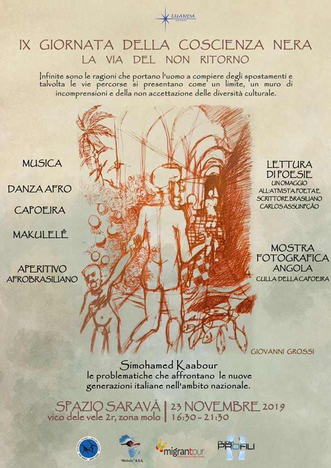 L’Associazione Luanda è lieta di invitarVi alla lX Giornata della Coscienza Nera che organizza quest’anno con la collaborazione dell’Associazione Italiana Capoeira da Angola (Gruppo di Genova), Associazione Nuovi profili, Associazione Mabota, Migrantour e Banda Faladeira. L’appuntamento è il 23 novembre presso lo Spazio Saravà, in Vico delle Vele 2r (zona Molo), dalle ore 16.30 alle 21.30.