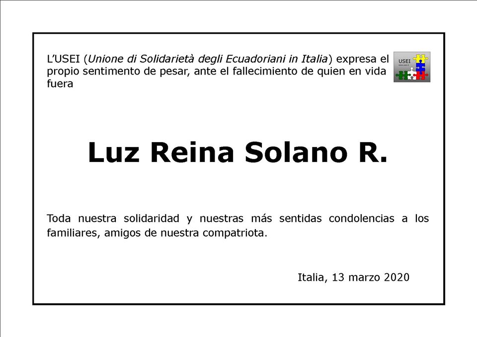 La ciudadana ecuatoriana, víctima del Coronavirus se llamaba Luz Reina Solorzano, radicada en Fidenza- Italia de 66años. La USEI , Unioni degli ecuadoriani in Italia, en su página facebook ha dado el pésame a toda la familia.