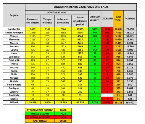 Crece a diario la epidemia de coronavirus, 59.138 personas han contraído el virus Sars-CoV-2 (5.560 más que ayer, con un crecimiento del 10,4%). Los datos fueron proporcionados por la Protección Civil. De ellos, 5,476 personas murieron (+651, + 13.5%) y 7024 (+952, + 15.7%) se recuperaron.