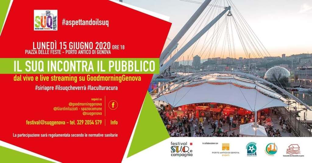 manifestazione che da oltre vent’anni sviluppa integrazione multiculturale e sensibilità ecologica, facendo incontrare artisti, scrittori, intellettuali provenienti da tutto il mondo in un suq ricostruito in riva al mare di Genova, città dove da sempre i popoli si incontrano intorno agli scambi del porto. Ma la voglia di ritrovarsi è tanta e le prime occasioni sono vicine. Lunedì 15 giugno 2020, in coincidenza con la riapertura dei teatri, il Suq incontra il pubblico in Piazza delle Feste al Porto Antico, dal vivo e in diretta streaming, in collaborazione con @ Goodmorning Genova . Proprio in questi giorni Piazza delle Feste doveva riempirsi dei colori e dei suoni del Suq e l’incontro lancia un segnale di speranza nel futuro, con qualche anticipazione sulla prossima edizione che slitta a fine agosto, da venerdì 28 agosto a domenica 6 settembre.