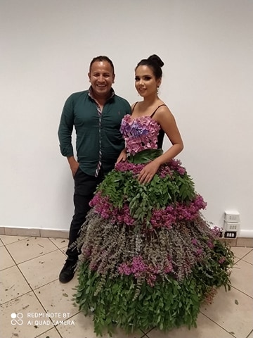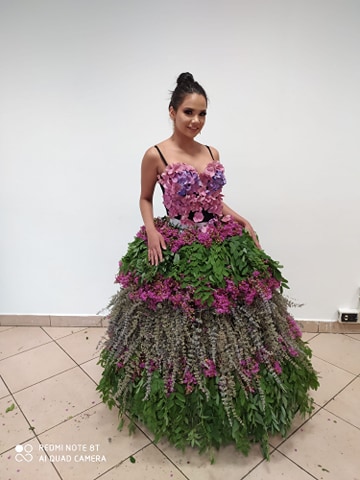 El vestido será confeccionado con Flores, sin agua, es un modo que este permanesca intacto. El vestido en un primer momento será indosado por la modelo y actriz ecuatoriana María Cedeño, luego será el momento de peinado y truco, y luego será un momentoimportante porque debe volver a indorsar el vestido casi terminado. No quiero relavar nada más para todos puedan seguir esta noche la directa.