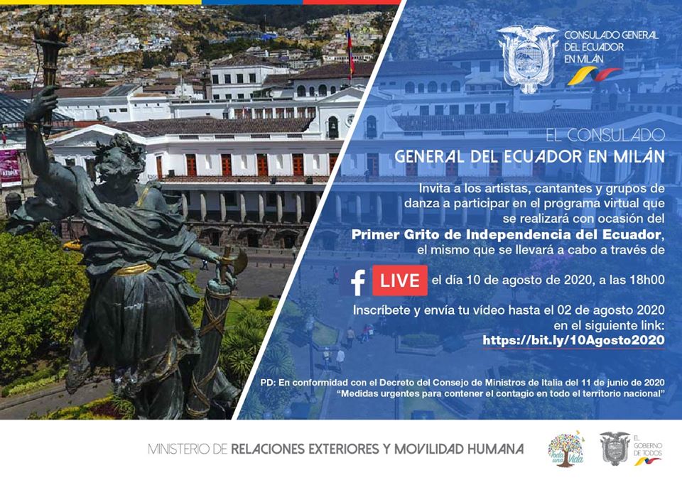 Recordamos además que, el día 10 de agosto a las 18:00 horas, realizaremos un evento CIVICO – CULTURAL a través de la plataforma institucional de FaceBook LIVE, con la participación de numerosos artistas ecuatorianos y la presencia de reconocidos medios de comunicación.