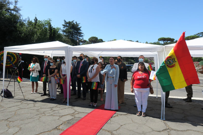 Para iniciar la ceremonia se entonó el Himno Nacional de Bolivia, para luego entonar el Himno Nacional de Italia, continuando con la Ofrenda floral depositada a los pies del Monumento de Simón Bolivar, plaza Torwaldsen. La Jefe de Misión Diplomatica y encargada de negocios de la Embajada de Bolivia, Marianne Michelle Guachalla Sahonero Encargada de Negocios en su discurso oficial a nombre de todos los ciudadanos bolivianos saludó y agradeció al Italia por haber acogido, al mismo tiempo felicitó al gobierno italiano como afrontó la crisis sanitaria COVID-19, para terminar su discurso la Jefe de Misión de la embajada se dirigió a la comunidad boliviana con un mensaje.