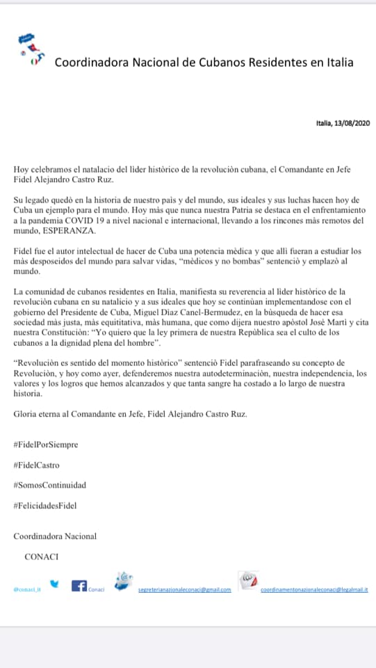 In Italia d’accordo alle ultime statistiche radicano al meno 23.476 cubani, 6.604 uomini e 16.872 femmine. Il Consolato Generale di Cuba a Milano, a voluto ricordare con un post nella pagina ufficiale di Facebook il natalizio del rivoluzionario.