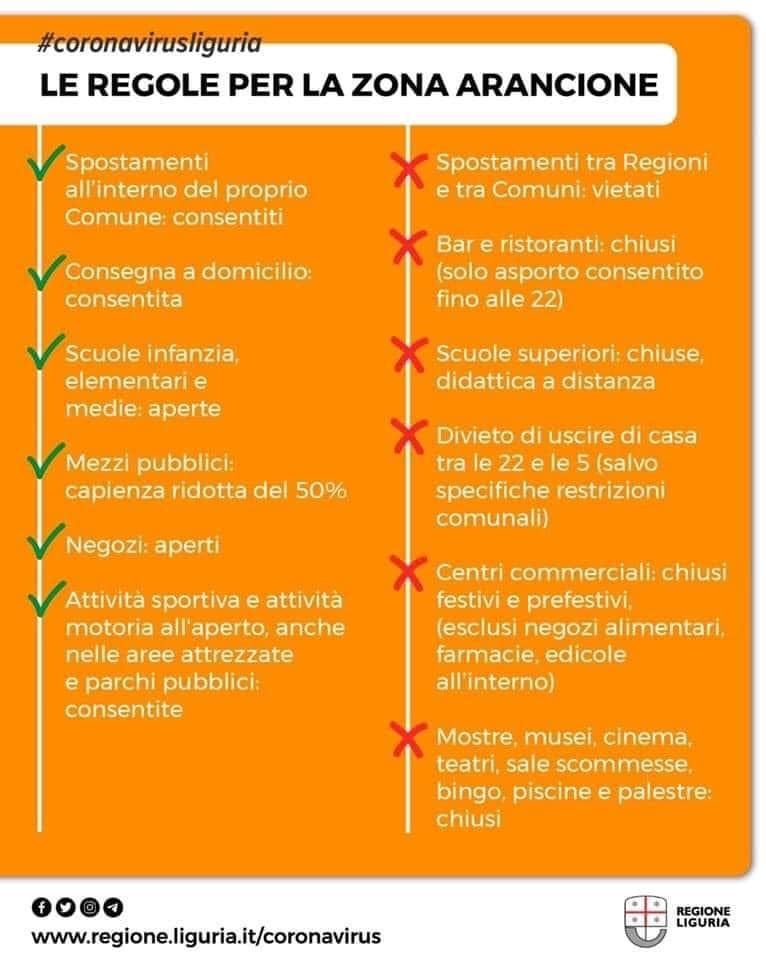 La Región Liguria, será zona Naranja a partir del miércoles. Por 15 días Liguria pasará a la zona naranja. Una decisión tomada por el gobierno, a los pocos días de la comunicación de la zona amarilla y ante datos públicos sustancialmente similares.