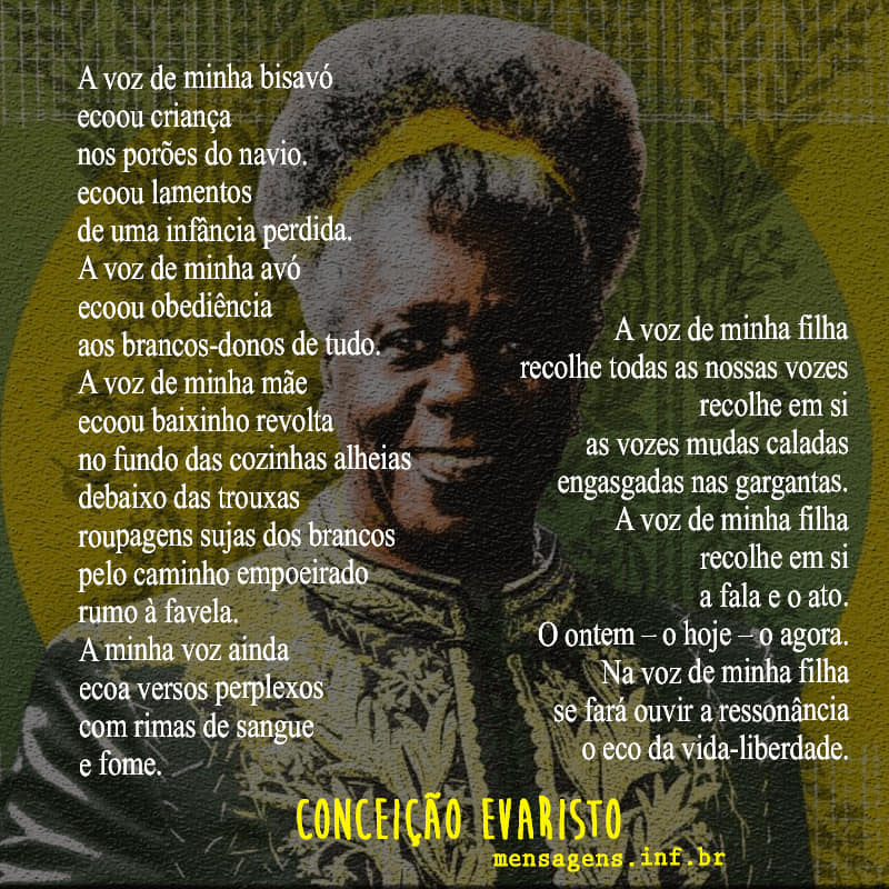 La voce della donna di colore nella letteratura brasiliana. Maria da Conceição Evaristo de Brito è una straordinaria insegnante e scrittrice brasiliana contemporanea, particolarmente attiva nei movimenti per la lotta dei neri. È nata il 29 novembre 1946 a Belo Horizonte, Minas Gerais.