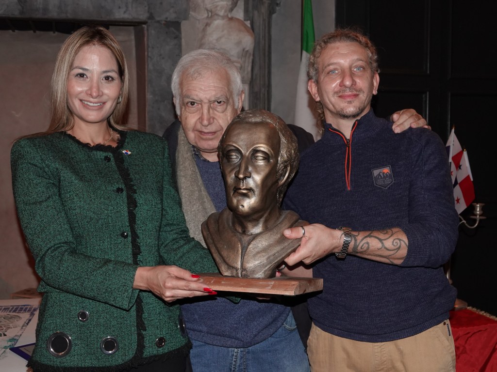 La console Virginia Abrego, Bruno Aloi e lo scultore Claudio Caporaso con il busto di Cristoforo Colombo che andrà alla Direzione del Canale di Panamà.