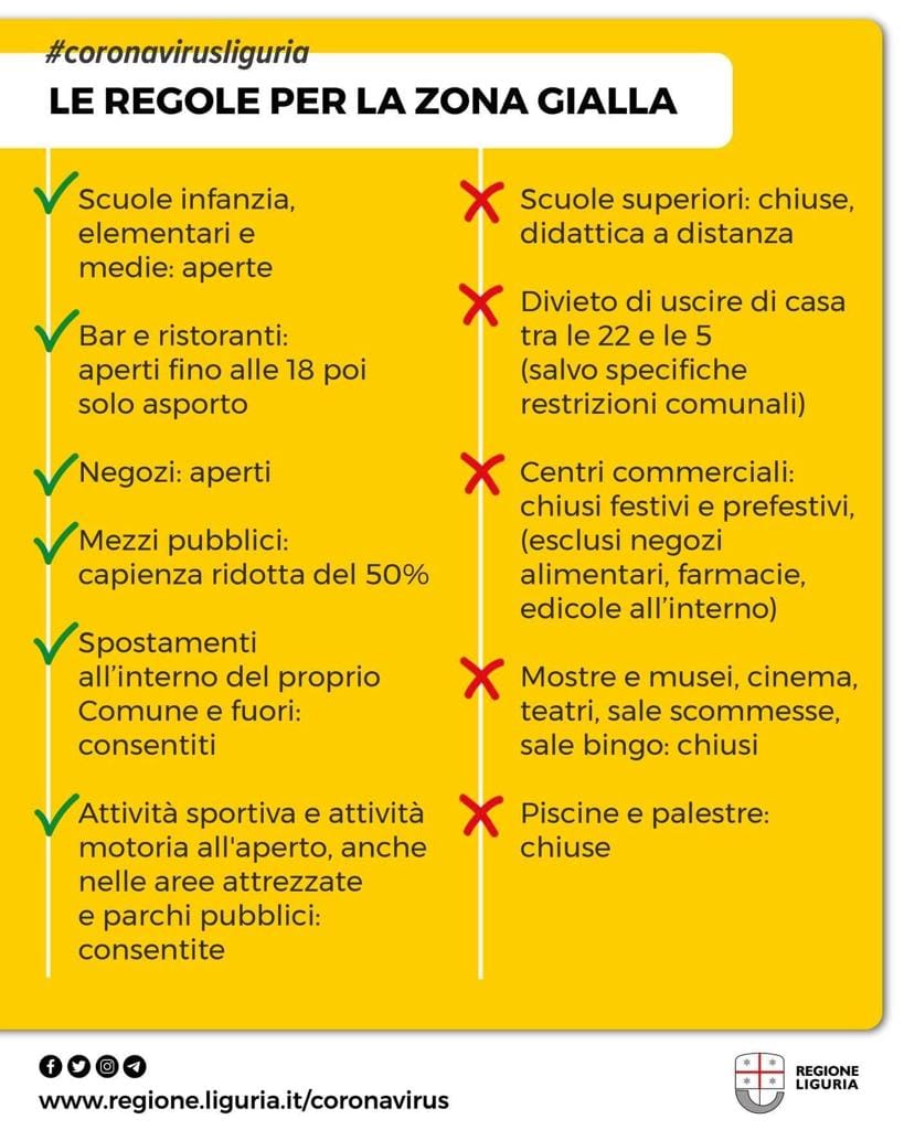 Así lo anunció el presidente Giovanni Toti luego de una entrevista con el ministro Speranza que anticipó la decisión de la CTS: desde el domingo 29 de noviembre (incluido), Liguria vuelve a la zona amarilla ✅ Será posible moverse entre Municipios y Regiones (solo si estas últimas son amarillas) ✅ Los bares y restaurantes reabren al público hasta las 6 p.m. ‼ ️ Recordamos a todos la máxima prudencia, continuando responsablemente con todos los comportamientos fundamentales para reducir la infección (mascarilla, higiene de manos, distancia, respeto a las normas) Todas las reglas de la zona amarilla 👇