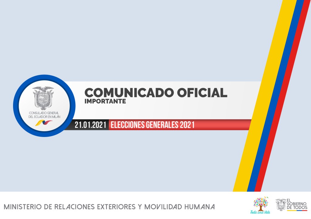 El Consulado General del Ecuador en Milán informa que, con relación a las Elecciones Generales 2021, el día domingo 7 de febrero de 2021, de 9:00 a 19:00 horas, los ciudadanos ecuatorianos que se encuentren debidamente empadronados en nuestra jurisdicción, podrán sufragar en el recinto electoral ubicado en la ciudad de Milán, MI.CO – Milano Congressi (Gate 3), Viale Eginardo, parada PORTELLO, metropolitana línea 5 “Lilla”.