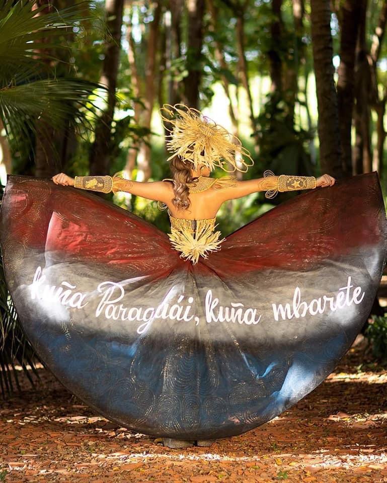 La falda del reverso está pintada con los colores patrios, en la franja media reza “kuña Paraguái, kuña mbarete” (“Mujer paraguaya, mujer fuerte”).