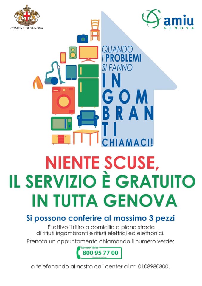 Genova, 19 marzo 2021 – Parte dal prossimo martedì, 23 marzo, il servizio di ritiro ingombranti gratuito a piano strada in tutta Genova. Con una semplice prenotazione telefonica, i cittadini potranno liberarsi di oggetti inutilizzati e inutilizzabili (come mobili e elettrodomestici) depositandoli il giorno concordato dal portone di casa.