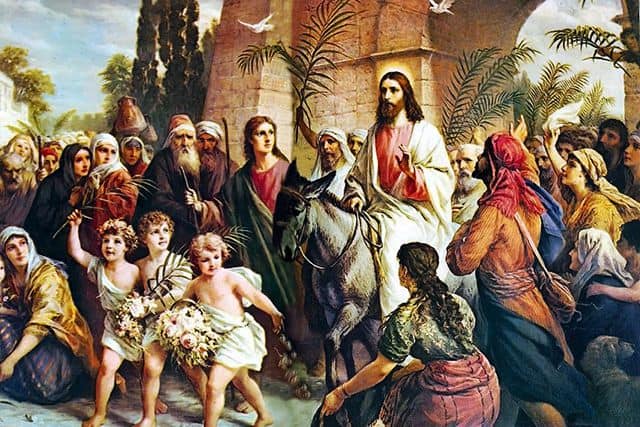 Jesús entró a Jerusalén montado sobre un asno y fue aclamado como rey por sus seguidores, quienes extendieron mantos, ramas de olivo y de palma a su paso. Gritaban: “¡Bendito el que viene en el nombre del Señor!”; “¡Hosanna en las alturas!”