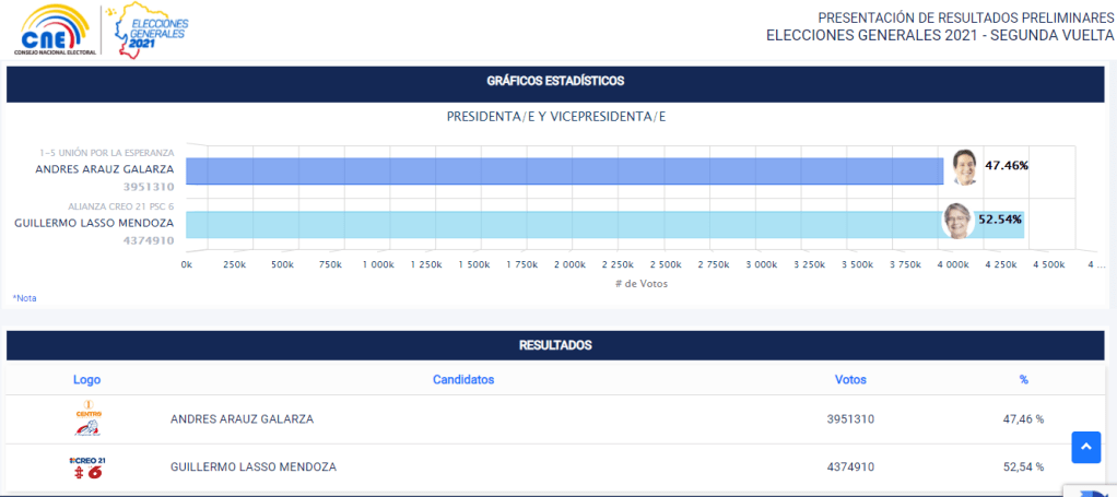 Con el 97.46% de las urnas escrutadas, #GuillermoLasso se convierte en el presidente electo Nº 45 de #Ecuador