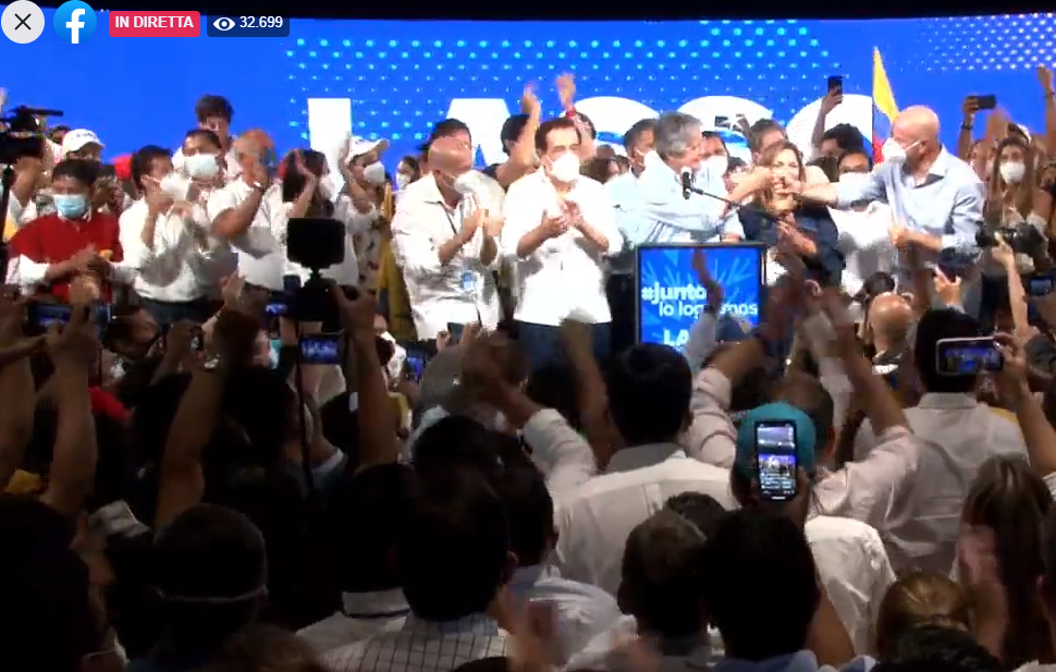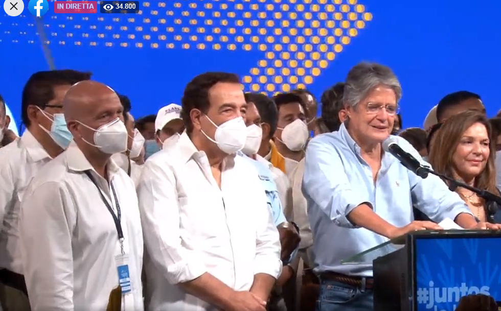 Con un emotivo discurso Guillermo Lasso, lider del Partido Creo, se convierte en el 45 Presidente electo de la República del Ecuador. Sus palabras iniciales fueron agradeciento a Dios y a sus padres que no se encuentran en esta luego agradeció a toda lider dl Partido social cristiano Jaime Nebot, lidel del Partido Social Crsitiano para agrdecer a Cesar Monge llamándolo hermano. Simpatiantes, equipo de trabajo, voluntarios familiares, y sobre todo a su esposa e hijos.