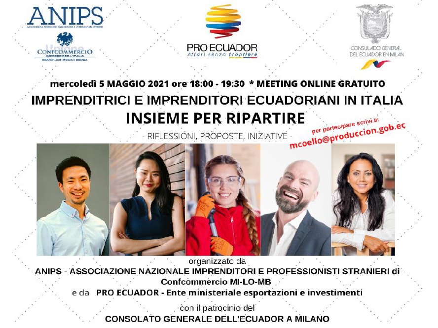 La Oficina Comercial del Ecuador en Italia, les invita a participar a la conferencia online : Emprendedores Ecuatorianos en Italia coorganizado con la ANIPS-Confcommercio y el apoyo del Consulado del Ecuador en Milán.