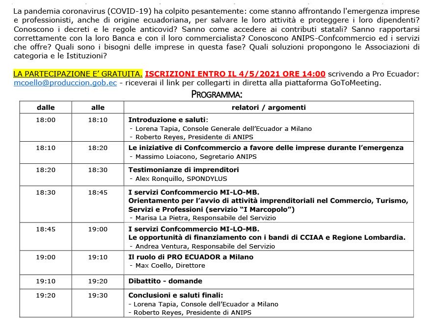 La pandemia del coronavirus (COVID-19) ha golpeado con fuerza, en un año y medio que la comunidad en general ha vivido una verdadera crisis sanitaria afectado a los empresarios en general causando una crisis económica. Por esta razón el Ente de Política de Comercio Exterior e Inversiones en Italia PRO-Ecuador en colaboración con la ANIPS Unione Confcommercio è l’Associazione y el auspicio institucional del Consulado General del Ecuador en Milán ditactarán una charla de información para los empresarios ecuatorianos de diferentes categorías, como poder anfrentar los problemas creados por el Covid-19