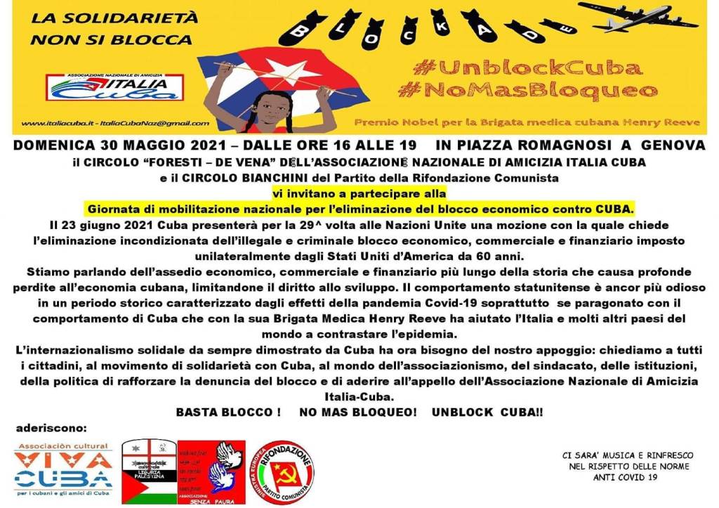 Giornata di mobilitazione nazionale per l’eliminazione del blocco economico contro CUBA. Il 23 giugno 2021, Cuba presenterà per la 29^ volta alle Nazioni Unite una mozione con la quale chiede l’eliminazione incondizionata dell’illegale e criminale blocco economico, commerciale e finanziario imposto unilateralmente dagli Stati Uniti d’America da 60 anni.