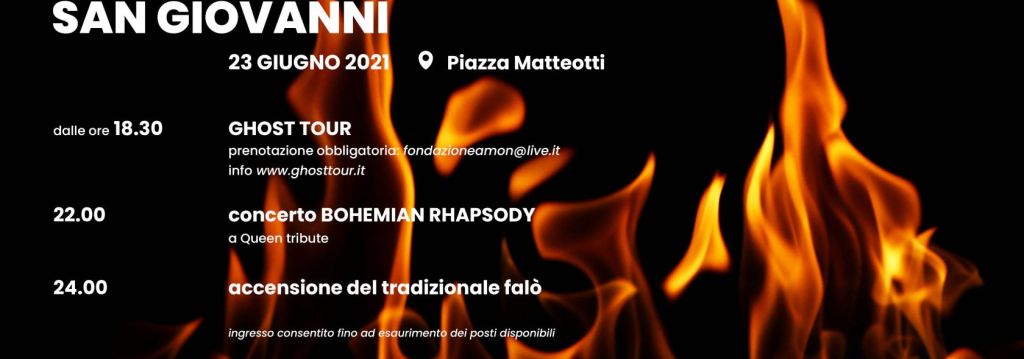 Appuntamento in Piazza Matteotti con il Concerto “Bohemian Rhapsody”- A Queen tribute, a seguire i miti e le leggende della notte di San Giovanni raccontate da Marco Pepè, ideatore del #GhostTour (sold out per la serata) e, infine, accensione del tradizionale #falòdiSanGiovanni alla presenza delle autorità.