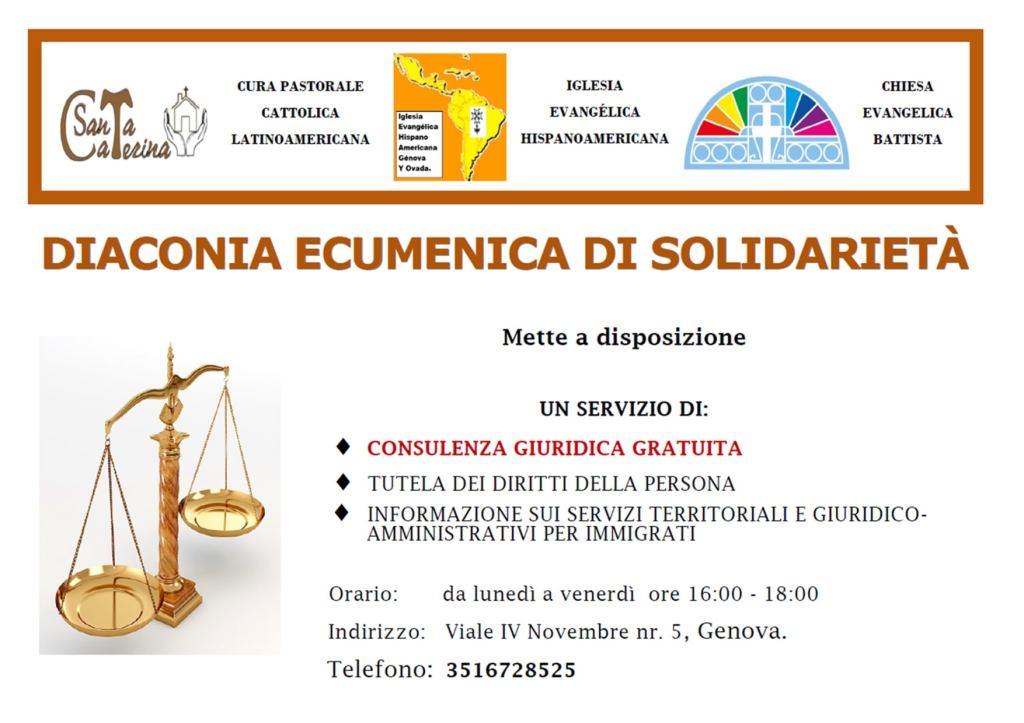 Reinicia sus actividades el día lunes 25 de octubre. Las personas que necesiten de consulencia legal pueden acercarse por el ingreso del parque Acquasola (Viale IV Novembre 5)