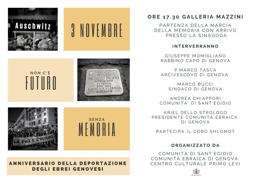 La deportación de los judíos de Génova comenzó el 3 de noviembre de 1943, una de las fechas más oscuras de la historia de la ciudad. La Comunidad de Sant’Egidio y la Comunidad Judía de Génova, junto con el Centro Cultural Primo Levi, han conservado la memoria de estos hechos en los últimos años, involucrando no solo a las instituciones, sino a muchos genoveses y en particular a las generaciones más jóvenes, los “nuevos Europeos ”Que se han integrado en el tejido de la ciudad.