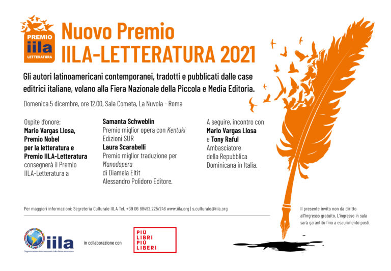Domenica 5 dicembre, alle ore 12.00, in Sala Cometa, alla presenza degli altri membri della Giuria, composta da esponenti del mondo accademico italiano specializzato nello studio e nella critica della letteratura latinoamericana, Mario Vargas Llosa consegnerà il Premio IILA Letteratura a Samanta Schweblin (Argentina, vincitrice del Premio alla miglior opera con “Kentuki”, Edizioni SUR, 2019) e a Laura Scarabelli, vincitrice del Premio alla miglior traduzione per “Manodopera” (Mano de obra) della scrittrice cilena Diamela Eltit (Alessandro Polidoro Editore, Napoli, 2020).