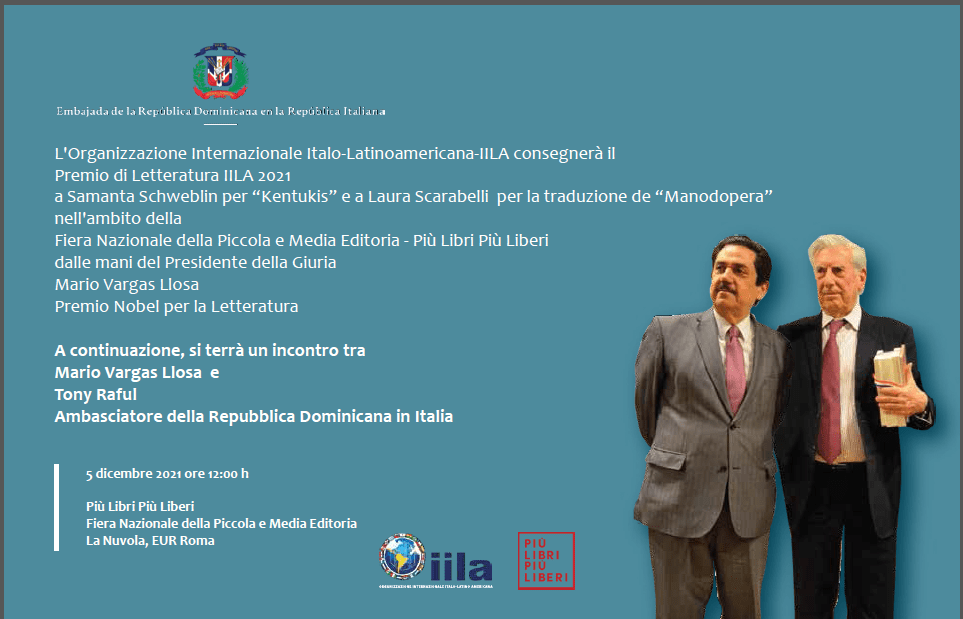 La consegna del Premio IILA-Letteratura è stata inserita nel contesto di Più libri più liberi come una felice iniziativa di promozione delle nuove voci della letteratura dell’America Latina e di impulso alla traduzione e all’industria editoriale duramente colpita dalla crisi dovuta alla pandemia. A seguire Mario Vargas Llosa, ispirandosi al filo conduttore di questa edizione della Fiera, “La libertà”, dialogherà con Tony Raful Tejada, Ambasciatore della Repubblica Dominicana in Italia, storico e intellettuale.