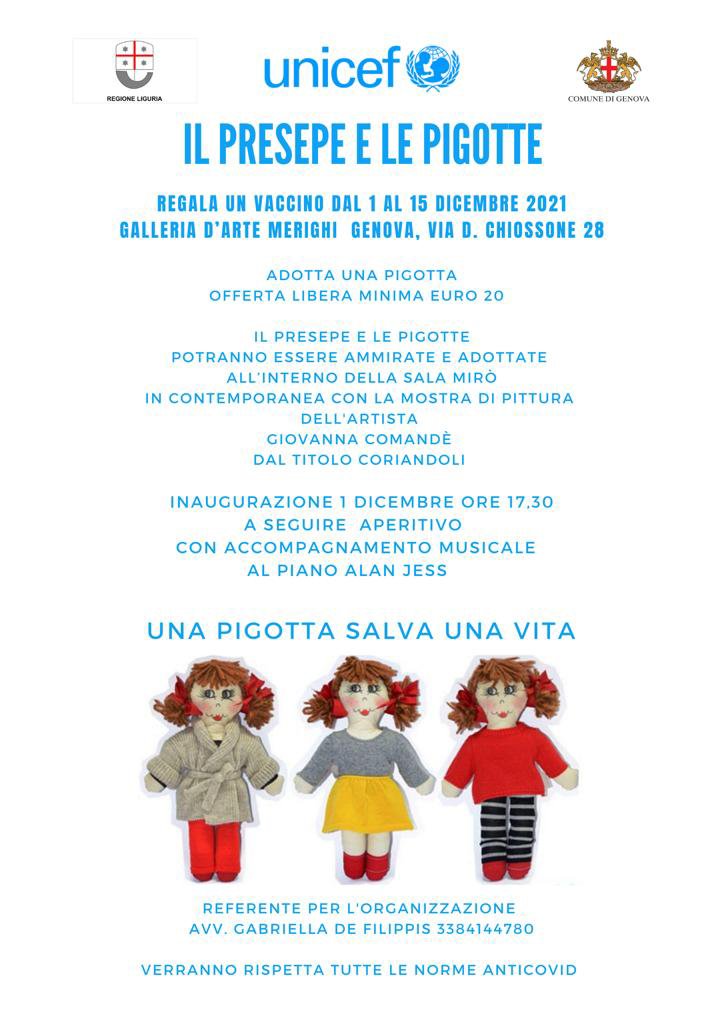 Mercoledì 1 Dicembre si terrà l’inaugurazione. ‘Il Presepe e le Pigotte’ iniziativa proposta dal UNICEF. L’incontro sarà in Galleria D’arte Meriggi in via D. Chiossone 28 alle 17.30. Con una pigotta se può regalare un vaccino.