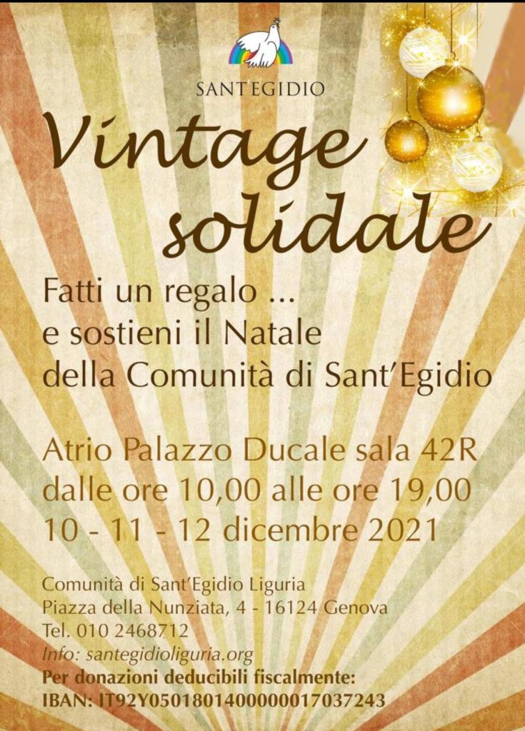 Un fin de semana en el Palacio Ducal y Sampierdarena. Los ingresos serán destinados para los almuerzos de Navidad 2021 Génova.- El espacio "Vintage Solidale" de la Comunidad de Sant'Egidio se inaugurará el 10 de diciembre en el Palazzo Ducale, el ya tradicional mercado de ropa, complementos, calzado y bisutería cuyos ingresos se destinarán a financiar las actividades del Navidad 2021, en particular los almuerzos navideños en los diferentes distritos de la ciudad con la gente seguida de Sant'Egidio y el reparto de cestas regalo de Navidad a las familias. El espacio "Vintage Solidale" estará abierto los días 10, 11 y 12 de diciembre de 10.00 a 19.00 en la sala 42R del atrio del Palazzo Ducale, a la izquierda de la taquilla. Para acceder es necesario tener el Grenn pass También este fin de semana se abrirá un espacio "Solidale Vintage" en Sampierdarena, en el Centro "Genti di Pace" en via Stennio, 4: viernes 10 de diciembre de 15.30 a 18.30 y sábado 11 de diciembre de 10.00 a 12.30 y de 15.30 a 18.30. Para más información: Comunidad de Sant’Egidio Liguria, Piazza della Nunziata 4, Génova - Tel. 010.2468712