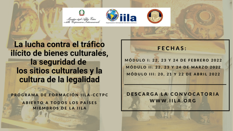 La Organización Internacional Ítalo-Latino Americana – IILA, en colaboración con el Comando Carabinieri Tutela Patrimonio Culturale (CCTPC) y con el apoyo de los Gobiernos de Bolivia, Ecuador y Perú – beneficiarios directos del Proyecto – organiza el curso virtual “La lucha contra el tráfico ilícito de bienes culturales, la seguridad de los sitios culturales y la cultura de la legalidad”.