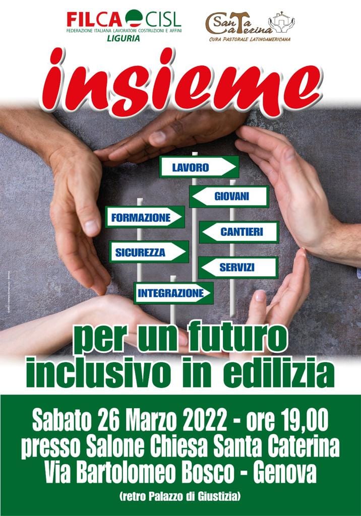 Siete tutti invitati all’incontro “Insieme per un futuro inclusivo in edilizia” con il segretario Generale FILCA CISL Liguria, Andrea Tafaria che ci parlerà di lavoro, formazione giovani, assegno unico, ed altre temi molto importanti.
