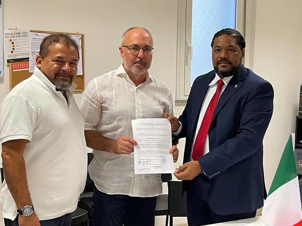En la presente firma Dr. Nelsón Carela Luna, Cónsul General de la República Dominicana en Génova, Dr. Carlos Girón, Vicecónsul, Dr. David Pazmiño, Consejero de Cónsul, Antonio García Presidente de la Asociación USEI, Inspector Pierfrancesco Sferraza Subdirector de la Oficina de Inmigración de la Jefatura de Policía de Savona, el Dr. Julio Cesar Garden Regalado Director de INDEX Italia, y varios representantes de la Comunidad Dominicana.